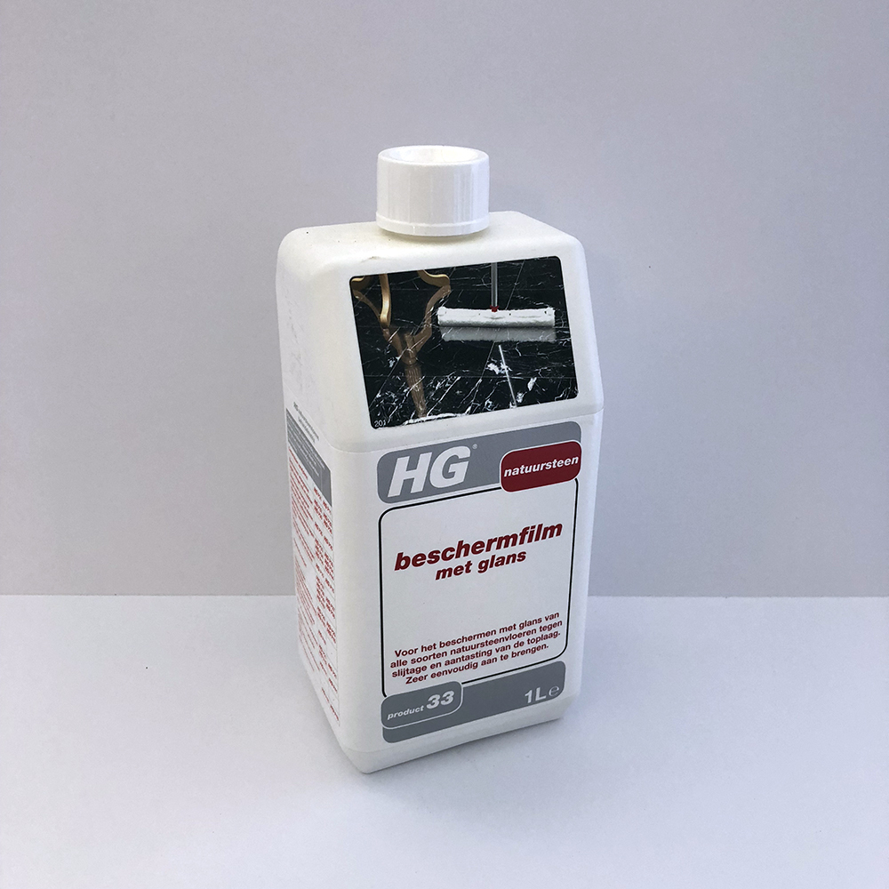 HG natuursteen beschermfilm met glans (shine finish) (HG product 33) is een zeer eenvoudig aan te brengen, vloeibare, polymeer emulsie die na droging een flinterdunne maar uiterst sterke, glanzende beschermfilm vormt. Hierdoor wordt de toplaag van het natuursteen beschermd tegen slijtage en beschadiging of aantasting door zuren zoals frisdranken en wijn. Deze beschermfilm geeft daarnaast ook een anti-slip effect. Verdun de vloeistof 1 op 1 met koud water, giet de oplossing over de vloer en verdeel het met behulp van een wasverdeler of roller in één richting over de vloer. Na ongeveer 40 minuten kan een tweede laag haaks op de eerste laag worden aangebracht. Eén liter is goed voor 60 – 80 m² vloeroppervlak. Dit product is ook verkrijgbaar in een matterende variant.