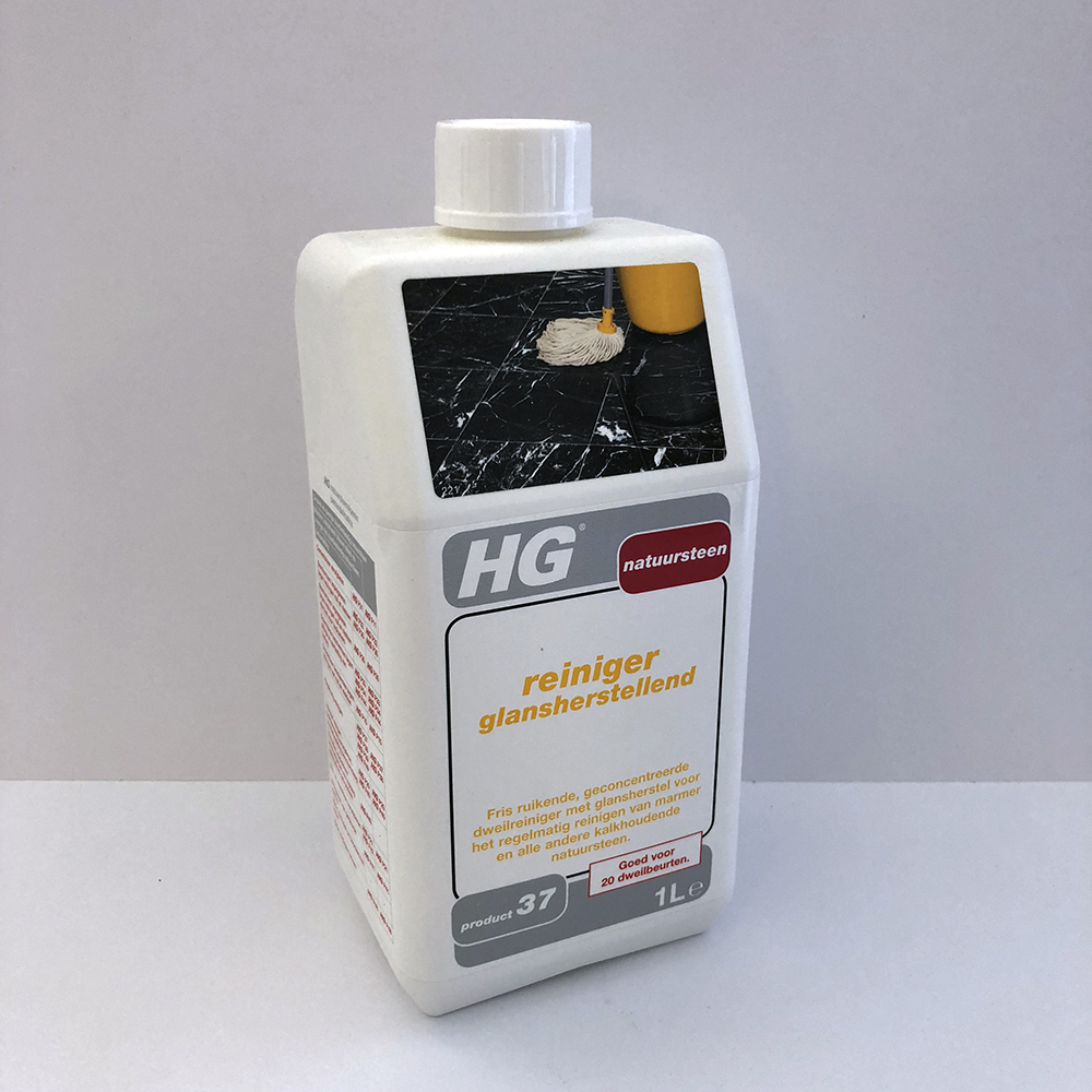 HG natuursteen reiniger glansherstellend (wash & shine) (HG product 37) is een heerlijk fris ruikende, geconcentreerde dweilreiniger speciaal ontwikkeld voor het regelmatig reinigen van marmer en alle andere kalkhoudende natuursteenvloeren. Het Is geschikt voor zowel onbehandelde vloeren als ook voor vloeren behandeld met HG beschermfilm met glans (shine finish) (HG product 33).Los 50 ml (een half kopje) op in een halve emmer (5L) lauw water. Vervolgens de vloer moppen of dweilen met een goed uitgewrongen mop of dweil en deze regelmatig goed uitspoelen in de gemaakte oplossing. Niet naspoelen of nadweilen en de vloer uit zichzelf laten drogen.