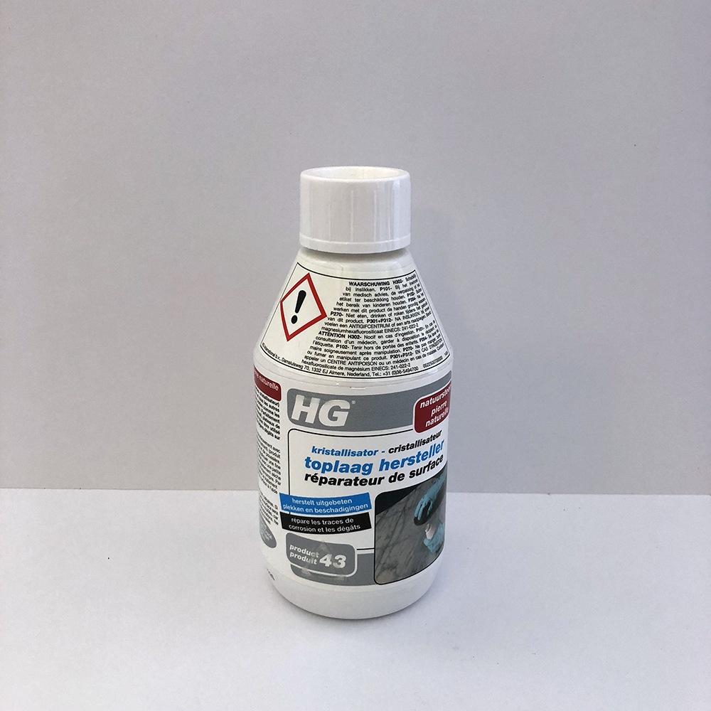 HG natuursteen toplaag hersteller (kristallisator) (HG product 43) herstelt beschadigingen van de toplaag van marmer en alle andere kalkhoudende natuursteensoorten als gevolg van etsing door zuren zoals frisdranken en wijn en herstelt tevens lichte beschadigingen door slijtage. Dit product is met name geschikt voor kleinere oppervlakken zoals aanrechtbladen, tafelbladen en vensterbanken, maar kan ook uitstekend gebruikt worden voor het herstellen van plaatselijke etsplekken of lichte beschadigingen op vloeren.